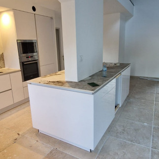 La cuisine existante a été conservée, mais totalement repensée dans son usage et son intégration. Plutôt que de tout changer, nous avons joué sur des interventions précises : l’ajout d’un îlot central, le remplacement du plan de travail par une finition céramique plus qualitative, et une crédence qui apporte une touche minérale et contemporaine. L’astuce ? Ouvrir la cuisine sur le séjour pour créer une circulation plus fluide et un espace plus convivial. Les clients voulaient une ambiance épurée, capable de mettre en valeur leurs œuvres d’art et leur mobilier. Mission accomplie : en retravaillant les alignements, les hauteurs et les finitions, nous avons donné une seconde vie à cette cuisine, sans en changer l’âme. Preuve qu’une rénovation réussie ne passe pas toujours par des travaux pharaoniques, mais par une réflexion fine sur ce qui peut être optimisé, amélioré, ou simplement mis en valeur.